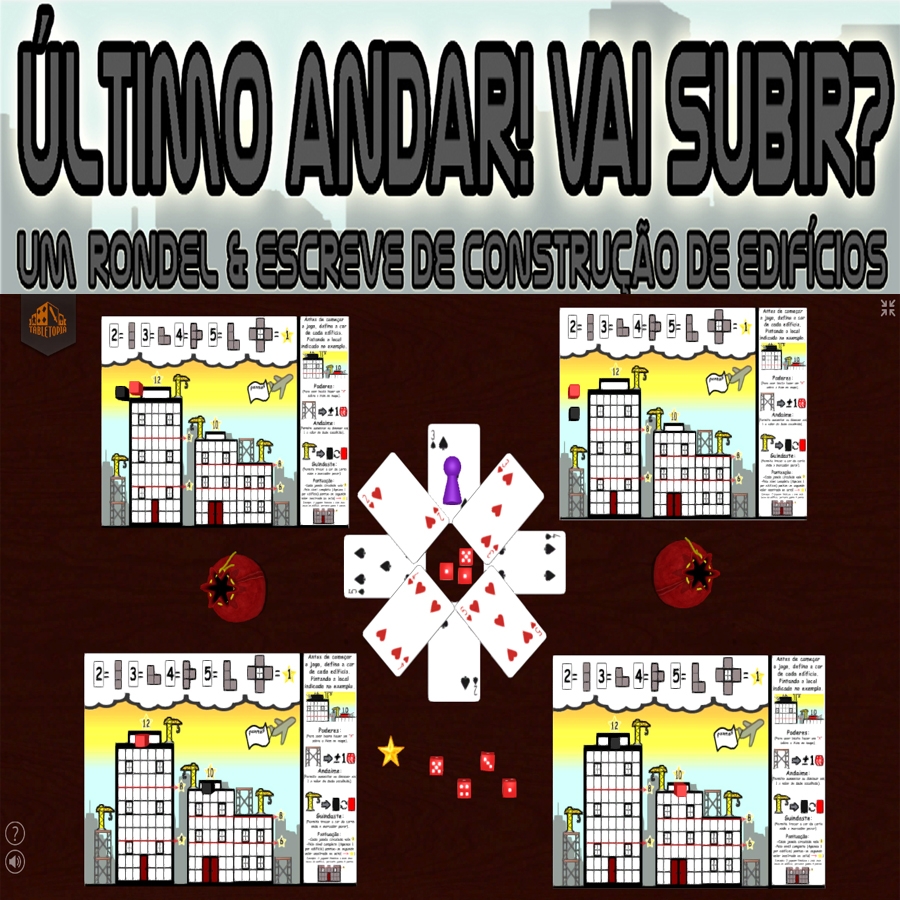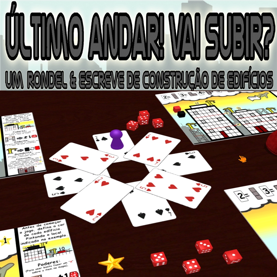 "Último andar! Vai subir? " é um print & play com mecânica de Rondel & Escreve onde cada jogador terá que construir o máximo possível de dois edifícios no prazo de 12 meses (12 rodadas). Em cada rodada jogadores farão um draft de dados e movimentaram o construtor através do rondel para definir quais formas poderão desenhar e assim construir seus edifícios. Um jogo familia e acessível, pois tudo que precisará para jogar, serão dados d6, um baralho comum, um marcador pra ser o construtor(tampinha de garrafa, meeple de outro jogo), lapis/caneta e o tabuleiro de jogo.