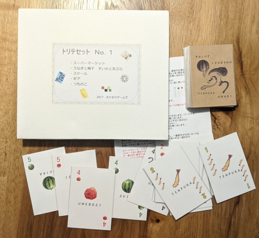 O jogo de vaza うなぎと梅干 すいかと天ぷら (Unagi Umeboshi Suika Tempura) foi lançado como parte da caixa de jogos de vaza da editora ruri ruri games (るりるりゲームズ) outono de 2017, intitulada トリテセット1 (Conjunto de Vazas 1 ).