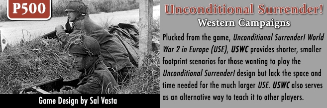Unconditional Surrender! Western Campaigns (USWC) é um jogo operacional / estratégico que abrange as campanhas da Segunda Guerra Mundial travadas entre as facções do Eixo e dos Aliados Ocidentais na Europa Ocidental. Com ênfase na projeção de força, os jogadores se concentram no quadro geral do gerenciamento de suas forças militares. Usando mecânica simples e baixa densidade de contadores no mapa, os jogadores lidam facilmente com a ação sem subsistemas complicados ou pilhas altas de contadores.