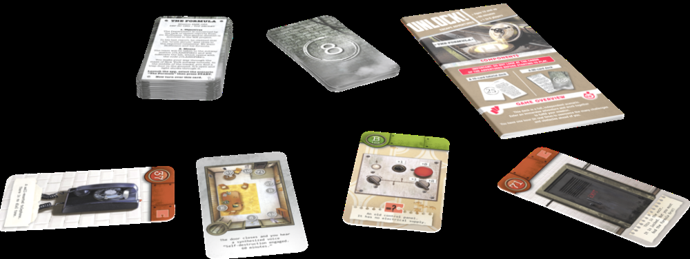 Unlock! The Formula é um jogo de cartas cooperativo inspirado em salas de escape que usa um sistema simples que permite pesquisar cenas, combinar objetos e resolver enigmas. Jogue Unlock! para embarcar em grandes aventuras, enquanto está sentado em uma mesa usando apenas cartas e um aplicativo complementar que pode fornecer pistas, verificar códigos, tempo de monitor, etc.
