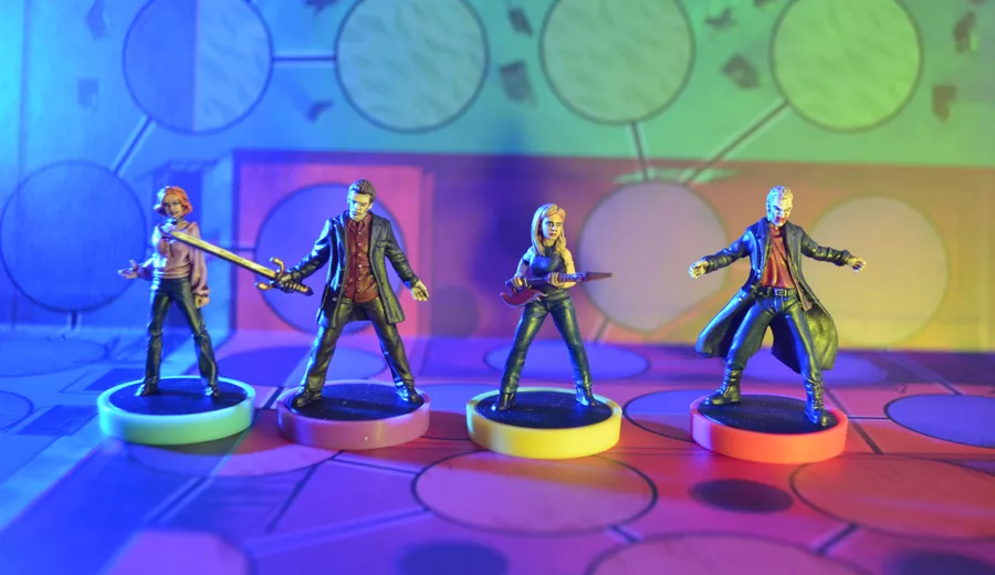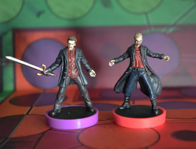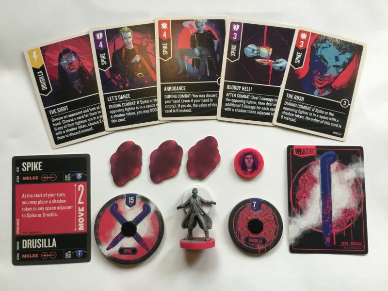 Unmatched: Buffy the Vampire Slayer apresenta quatro heróis. Buffy vai acertar você com o Sr. Pointy ou invocar a força de seu Slayer para um chute estrelado. Quando chegar a hora do reforço, ela escolherá entre o perspicaz Giles ou o confiável Xander. Spike, um caçador implacável, busca as sombras e invoca a Visão de Drusilla para deixá-lo saber exatamente onde e quando atacar. Willow, uma bruxa incomparável, se interessa por magia negra e se arrisca a se tornar mais sombria, potente mas perigosa. Às vezes, apenas Tara pode trazê-la de volta da beira do abismo. Angel, uma vez o Flagelo da Europa, é amaldiçoado com uma alma, em conflito com suas vitórias e se consolando em suas perdas. A fé existe para garantir que as coisas continuem "cinco por cinco".