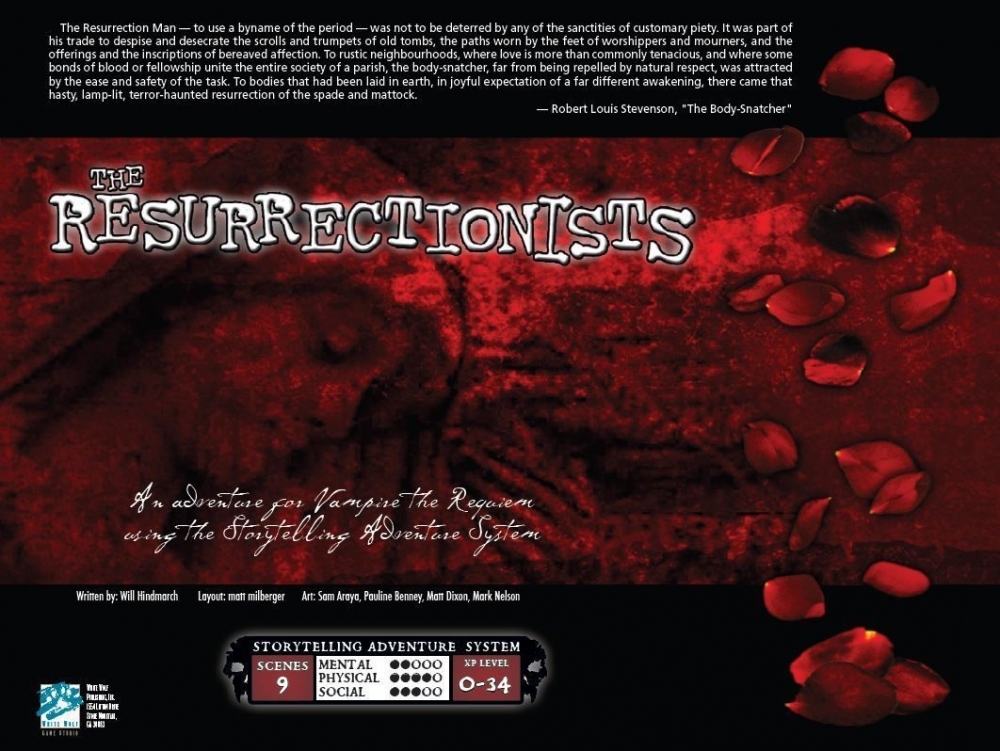 Você tem as únicas pistas conhecidas de seu paradeiro, uma caixa lacrada contendo algo seu que supostamente vai acordá-lo e, uma noite, para encontrar seu túmulo, desenterrá-lo e trazê-lo de volta para a cidade. Vá em frente. Esta noite, vocês são os Ressurreicionistas.
