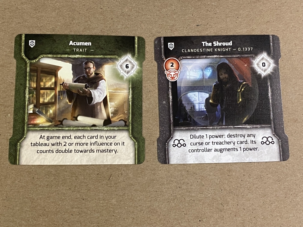 Uma característica chamada Perspicácia que dobra a contagem para o domínio de cartas com influência 2+ no final do jogo.