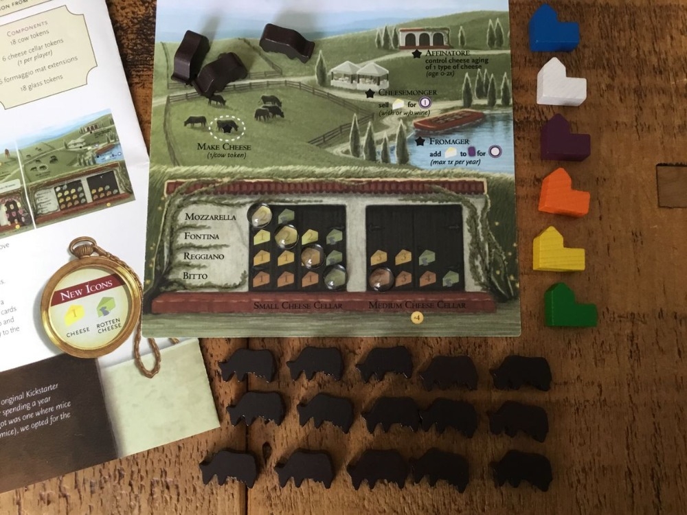 Esta expansão vem com 18 vacas e seis fichas de adega de queijo. As vacas podem ser negociadas no espaço “trocar uma por uma” no tabuleiro de jogo estendido da Toscana. Eles podem ser negociados por £3, 1VP, duas cartas ou uma ficha de uva. Você pode trocar sua vaca sem fazer queijo. Você pode ter no máximo quatro vacas.