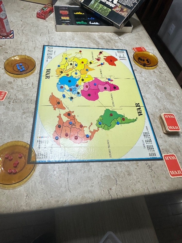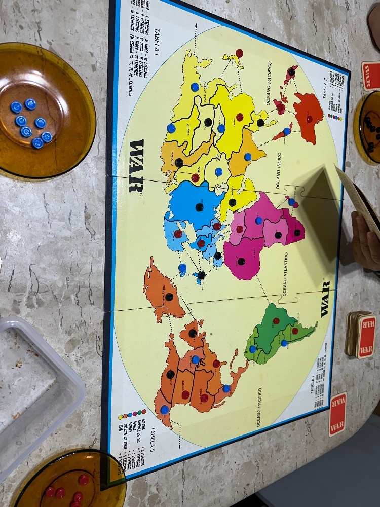 - 1 tabuleiro com um mapa contendo 6 continentes, cada um deles dividido em um determinado número de territórios.