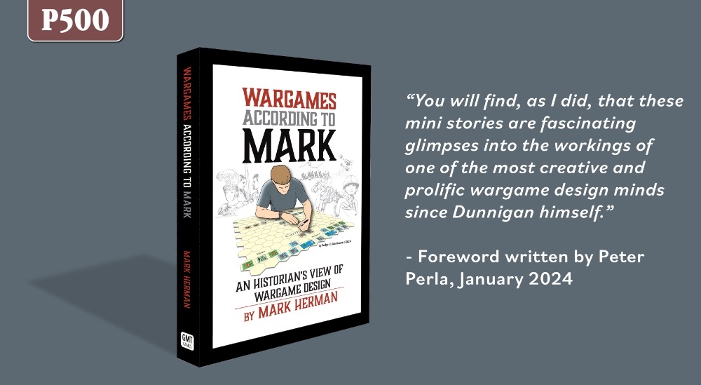 Tudo isso para dizer o seguinte: quando alguém tão talentoso, experiente e realizado em nossa indústria como Mark Herman escreve um livro sobre design de jogos que conta histórias sobre suas experiências ao longo de mais de 45 anos de carreira em nossa indústria, esse é um livro que estou vou ler. Quando aquele autor me perguntar se a GMT iria publicá-lo com ele, simplesmente não vou dizer não de jeito nenhum. Então, estou emocionado por hoje adicionarmos um livro à nossa lista P500 pela primeira vez! É tão apropriado, devido às muitas maneiras pelas quais sua presença, talentos e conselhos de liderança agraciaram a GMT ao longo dos anos, que nosso primeiro livro P500 seja de Mark Herman.