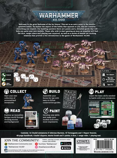 Dê os primeiros passos no 41º Milênio com este Conjunto Introdutório para Warhammer 40.000. Esta caixa é uma ótima maneira de se familiarizar com esse hobby incrível, enquanto você constrói e pinta modelos incríveis e depois joga seus primeiros jogos. Inclui dois conjuntos de modelos push-fit, um conjunto de ferramentas e tintas para hobby, um tapete de jogo, guias úteis, fichas e marcadores de terreno, além de todos os dados e ferramentas que você precisa para jogar. Escolha os nobres Space Marines ou os Tyranids, dê o controle dos outros modelos a um amigo ou membro da família e lute por horas de entretenimento. Se você está pensando em experimentar Warhammer 40.000, esta é sua chance – também é uma excelente maneira de expandir suas coleções existentes.
