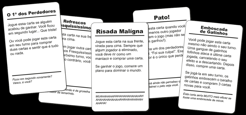 - Todos compram duas cartas. Na sua vez, compre outra carta e escolha uma delas pra jogar, seguindo o que a carta escolhida manda você fazer.