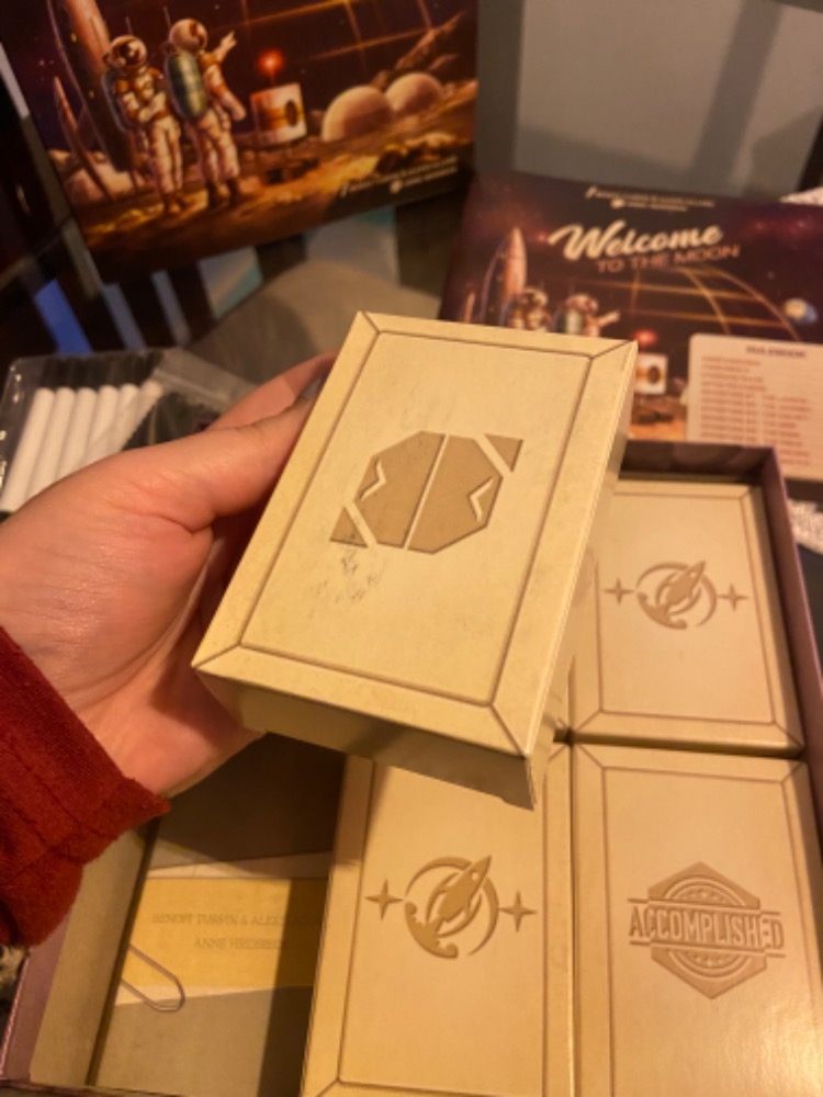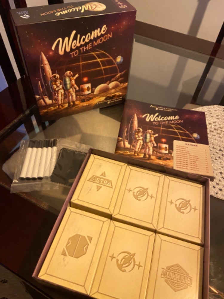 Moon mantém o mesmo mecanismo de rolar e escrever com o mecanismo de dados sem dados de Welcome to ... Your Perfect Home: você vira cartas de três pilhas para fazer três conjuntos diferentes com um número de shep e uma ação correspondente a partir da qual todos podem escolher 1. Você usa o número para preencher um espaço em uma zona em sua rua em ordem numérica. E todos estão correndo para ser os primeiros a cumprir metas públicas.
