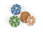 24 fichas de gado de plástico (8 azuis, 8 verdes, 8 laranjas) para substituir as fichas de papelão do jogo. 32 mm de diâmetro, 3 mm de espessura, 14 g cada.