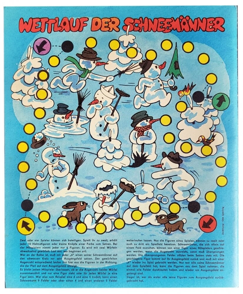 Se for a sua vez, você deve colocar um de seus bonecos de neve no círculo preto em frente ao seu quadrado inicial a cada 6. De acordo com o número de pontos lançados, as figuras correm daqui na direção indicada pela seta no início espaço. Cabe a cada jogador somar o número de pontos em ambos os dados e mover apenas uma figura ou colocar uma figura para cada dado. Apenas as figuras de um jogador podem ocupar um espaço em pares ou trios. Bonecos de neve, que estão descansando sozinhos em um quadrado, podem ser capturados pela figura de um oponente. A peça capturada é devolvida ao seu quadrado original e deve ser trazida de volta ao jogo com um 6. Somente se você tiver todos os seus bonecos de neve na pista é que poderá retirar do jogo as figuras que percorreram todos os espaços e retornaram ao ponto inicial. espaço. O vencedor é o primeiro a remover todos os seus bonecos de neve da pista.