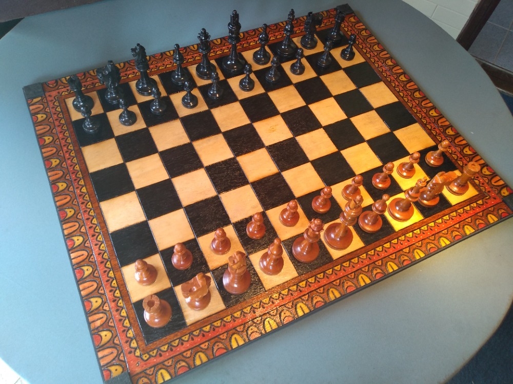Tabuleiro e peças criadas por Paulo Netto do Arte em Fogo