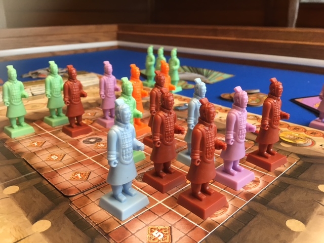 36 guerreiros de terracota: miniaturas de plástico (12 guerreiros marrons representando as estátuas ainda não pintadas e 6 de cada cor: roxo, laranja, cyan e verde claro)