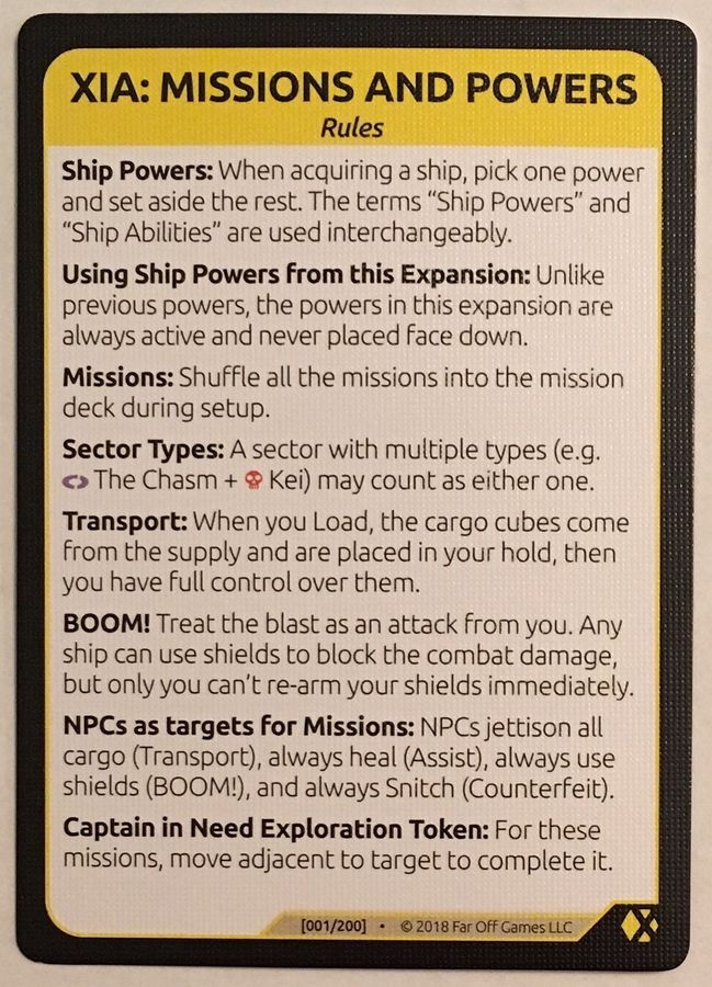 Xia: Missions and Powers é uma mini-expansão para Xia: Legends of a Drift System. Inclui 54 cartas: