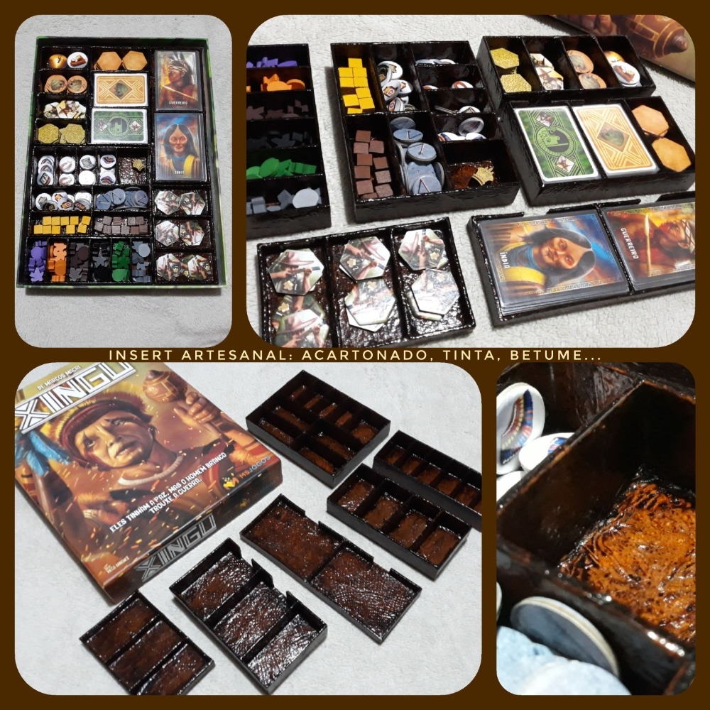 Insert customizado artesanal, utilizando: papel paraná, cola, papel toalha para textura, tinta marrom (clareado com laranja), verniz, betume, verniz denovo, por fim, silicone gel para não grudar as peças no verniz.