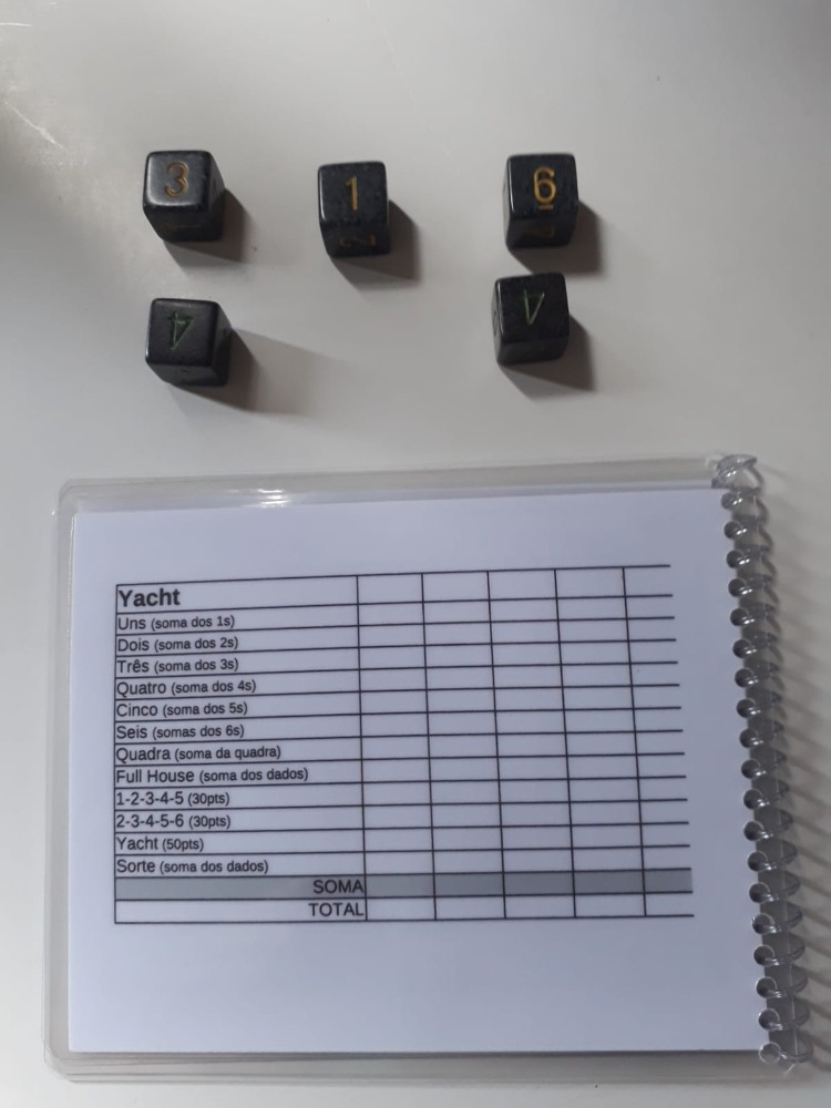 5 dados comuns de 6 faces e cartela de pontuações