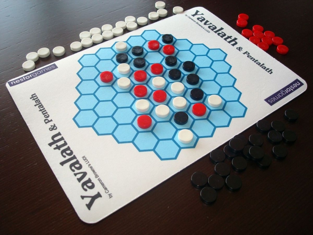 Yavalath é um jogo abstrato para dois (ou 3) jogadores. Os jogadores tentam criar uma linha reta de 4 peças de sua cor mas, se antes disso acontecer, eles criarem uma linha de 3 peças, eles perdem.