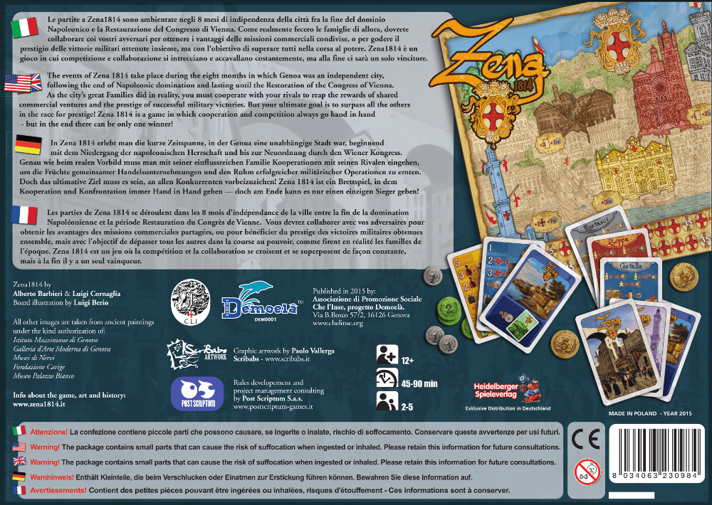 Os acontecimentos de Zena 1814 têm lugar durante os oito meses em que Gênova foi uma cidade independente, após o fim da dominação napoleônica e durou até a Restauração do Congresso de Viena. Como grandes famílias da cidade, na realidade, você deve cooperar com seus rivais para colher os frutos de empreendimentos comerciais compartilhados e do prestígio de vitórias militares bem-sucedidas. Mas seu objetivo final é superar todos os outros na corrida de prestígio! Zena 1814 é um jogo em que a cooperação e concorrência sempre andam de mãos dadas - mas no final só pode haver um vencedor!