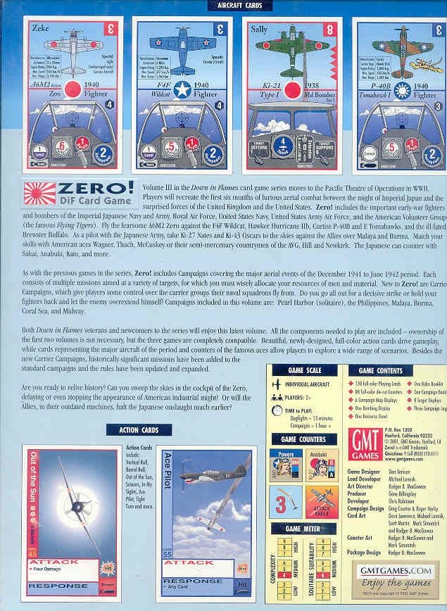 O volume III da série de card games Down in Flames move-se para o Teatro de Operações do Pacífico na Segunda Guerra. Jogadores irão recriar os primeiros seis meses de combates aéreos furiosos entre a bravura do Japão e as forças surpreendidas do Reino Unido e dos Estados Unidos. Zero! inclui os importantes aviões de ataque e bombardeiros do começo da guerra da Marinha e do Exército Imperial Japonês, Royal Air Force, United States Army Air Force, e o American Volunteer Group (o famoso Flying Tigers). Pilote o espantoso A6M2 Zero contra os F4F Wildcat, Hawker Hurricane IIb, Curtiss P-40B e E Tomahawks, e o destinado ao fracasso Brewster Buffalo.