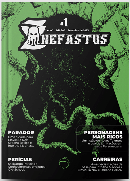 Primeira edição de nossa Zine Oficial trimestral. Nessa edição trazemos Talentos e Imperfeições para seus personagens, Especializações para o Nefastus, uma nova regra de perícias e a cidade de Parador para Into the Madness, Urbana Bellica e Clavicula Nox.