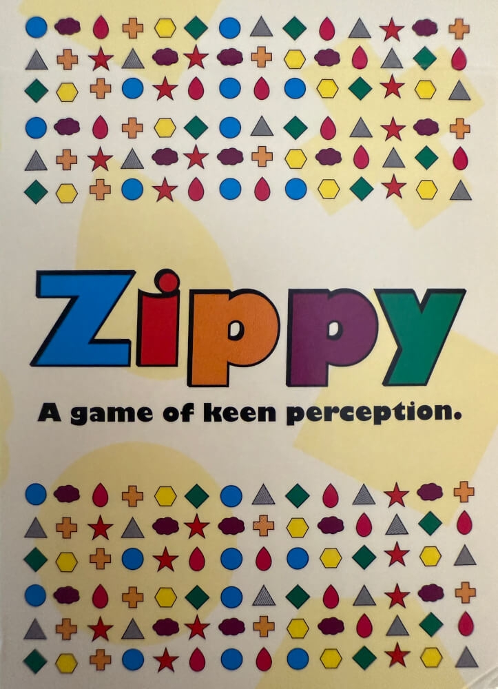 "Zippy" é um jogo de cartas. É um jogo de percepção visual rápido (como Spot It) onde os jogadores competem para encontrar a única forma/símbolo correspondente entre duas cartas, promovendo o reconhecimento de padrões, a contagem e os reflexos.