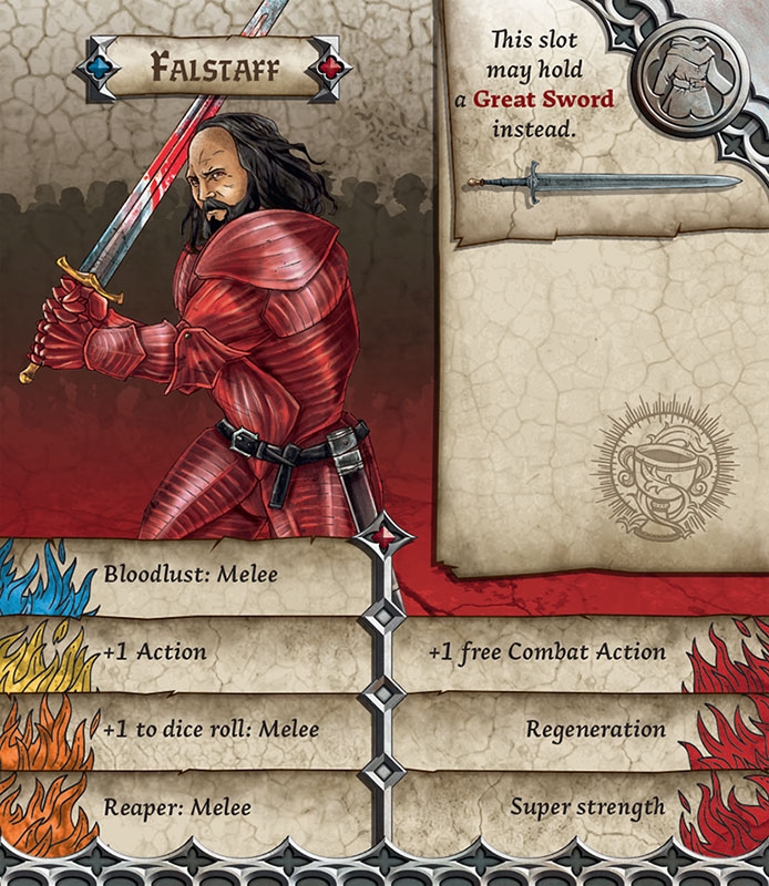 Falstaff é um sobrevivente promocional disponível para aqueles que participaram da campanha do Zombicide Black Plague no Kickstarter que inclui uma miniatura e um cartão de identificação.