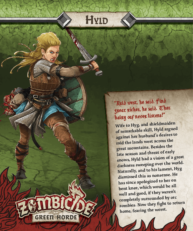 Hyld é uma sobrevivente promocional disponível para aqueles que participaram da campanha do Zombicide Green Horde no Kickstarter que inclui uma miniatura e um cartão de identificação.