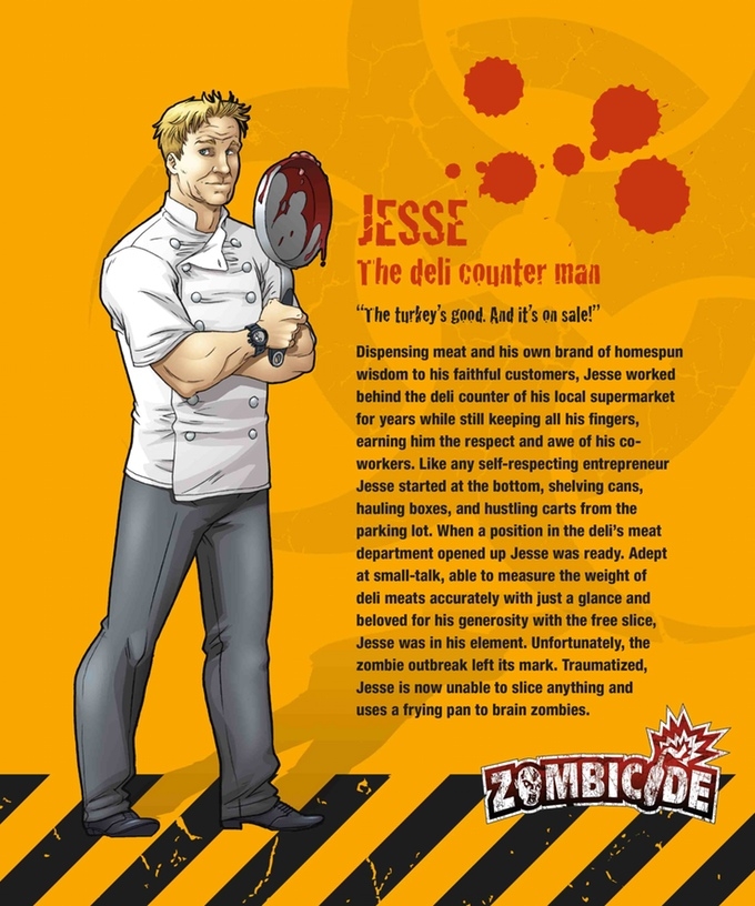Distribuindo embutidos e seus ditados pessoais para seus clientes fiéis, Jesse trabalhou atrás do balcão de frios do supermercado local por anos, sem perder nenhum dedo, conquistando o respeito e admiração de seus colegas. Como qualquer empreendedor que se preze, Jesse começou por baixo, colocando latas nas prateleiras, carregando caixas e juntando carrinhos pelo estacionamento. Quando um posto na sessão de frios abriu, Jesse estava pronto. Bom no bate-papo, capaz de pesar um presunto precisamente com apenas uma olhada e amado por sua generosidade com as amostras gratis, Jesse estava em seu elemento. Infelizmente, a invasão zumbi deixou sua marca. Traumatizado, Jesse ficou incapaz de fatiar qualquer coisa e usa uma frigideira para espatifar o cérebro dos zumbis.