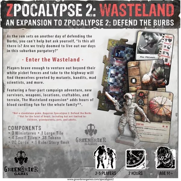 Jogadores corajosos o suficiente para aventurar-se para além de suas cercas de piquete e andar para a rodovia em Zpocalypse 2: Wasteland, uma expansão para Zpocalypse 2: Defender o Burbs, serão recebidos por mutantes, bandidos, cientistas loucos e muito mais.