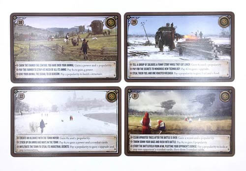Este promo pack para Scythe inclui Encounter Cards dos números 29 ao 32.