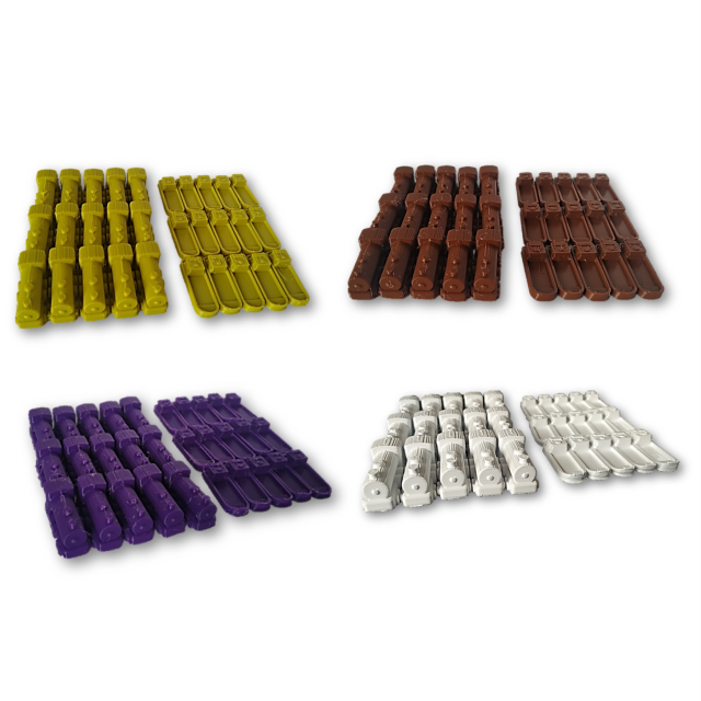 - 14 Trens em 4 cores (amarelo, branco, marrom e roxo)