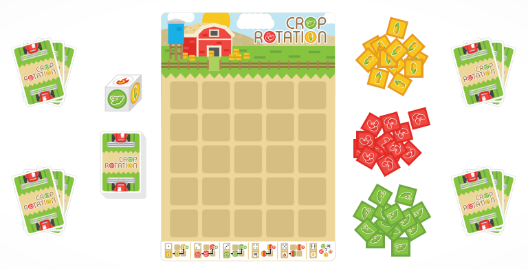 O Crop Rotation é um jogo de alocação de peças e reconhecimento de padrões que acabou de ser publicado aqui pelo Studio Teia de Jogos. A sua mecânica básica consiste em colocar em um tabuleiro de plantio peças referentes a 3 culturas diferentes (feijão, soja e milho) para formar padrões presentes em cartas de objetivo possuídas pelos jogadores. Para incrementar, um dado é lançado no começo de cada turno do jogador, fornecendo vantagens que variam entre poder colocar uma peça adicional adjacente, substituir uma peça por outra ou retirar uma peça adjacente a sua jogada.