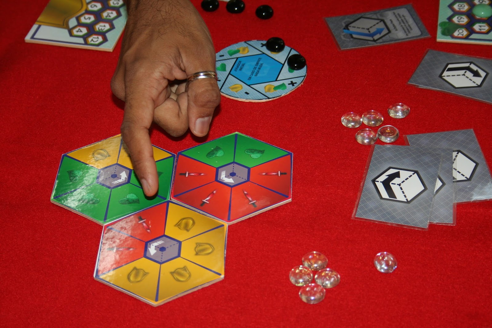 Triax, um jogo que está em fase de desenvolvimento e o autor levou para testar com o público do evento. Ele é um jogo de cartas que utiliza um sistema diferente para geração de recurso para baixá-las. São três hexágonos, cada um com três cores, que devem ser rotacionados. O verde é cura, o amarelo é defesa e o vermelho é ataque. Existem também cartas de cor azul e cinza que tem condições próprias para serem colocadas na mesa.