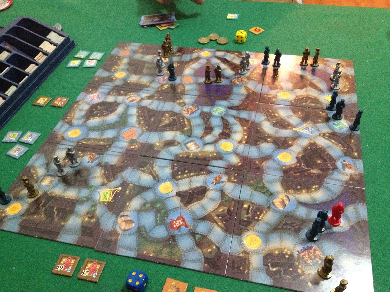 O jogo tem uma mecânica de movimentação muito bacana, você começa com 10 piratas e precisa mover o Capitão pela interseções da cidade, para isso você deixa uma quantidade de piratas seus até chegar ao próximo ponto e resolve a ação, caso queira pode gastar uma moeda para fazer isso novamente.