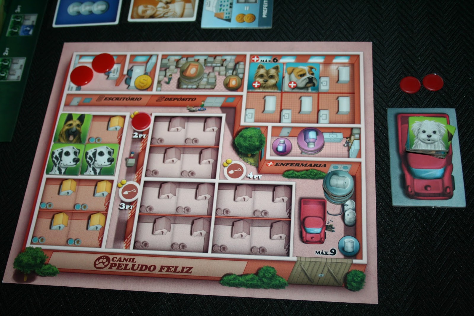 A edição gringa também alterou a cor da parte de trás dos tiles dos cães para diferenciar os do campo e os da cidade, aqui é branco e preto, lá eles alteraram para azul e verde. Além disso, eles adicionaram sacolas para colocar os cães, que não ficarão mais empilhados. Acho que isso organiza melhor o jogo e ainda dificulta um pouco calcular o seu final.
