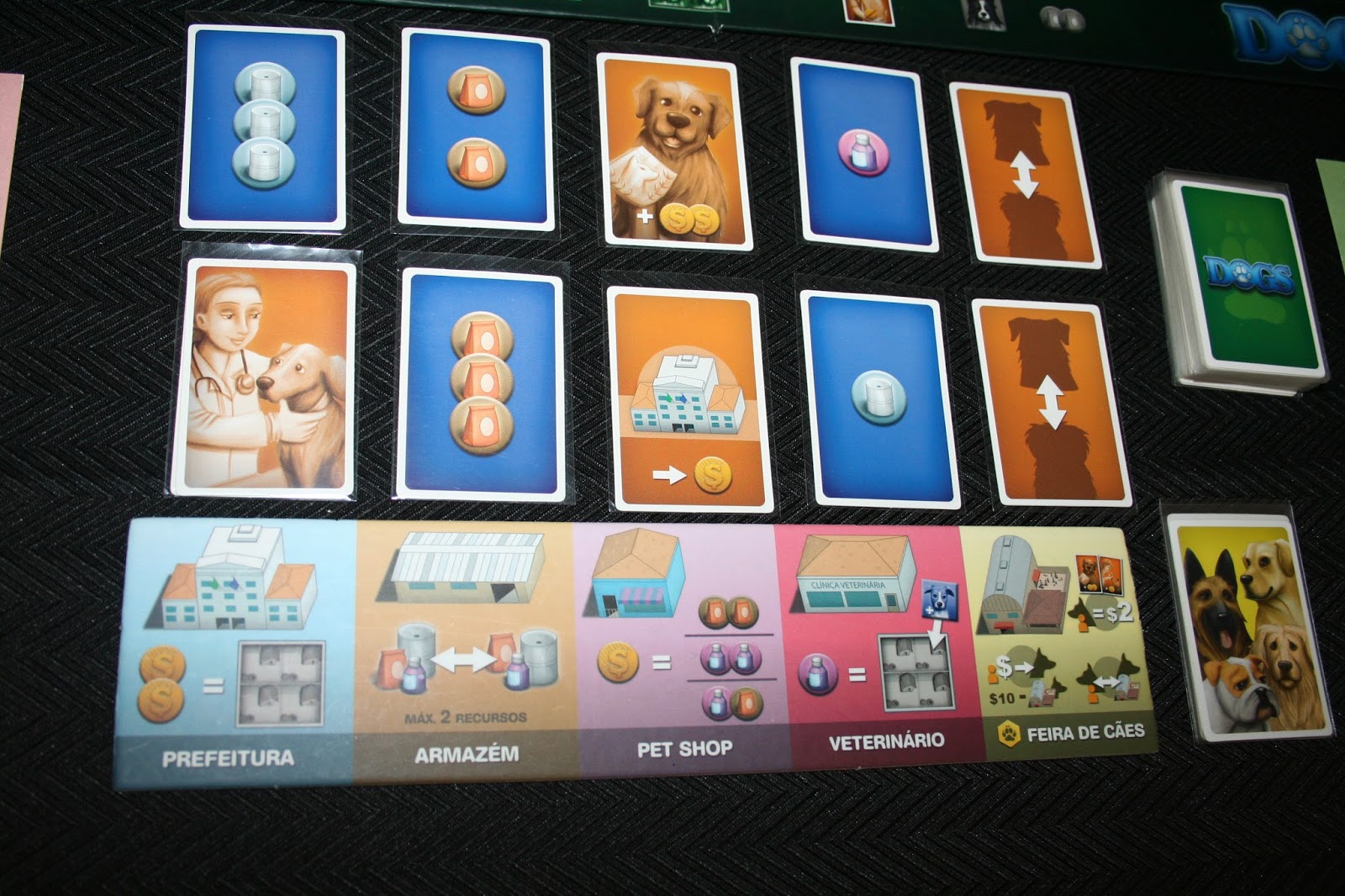 O jogo que está em FC no Kickstarter apresenta modificações mínimas em relação do que já foi lançado aqui no Brasil. Isso é algo que merece destaque porque demostra a sua qualidade. Eles mesmos destacam essa informação na página do financiamento. O jogo passou por alterações estéticas e adições de regras, mas tudo bem pequeno. A edição internacional de Dogs altera a arte das cartas, que eu ainda prefiro a da nossa edição, e a arte do tabuleiro de seleção de ações, essa realmente ficou melhor na versão gringa. Eles adicionaram um espaço para cada animal da feira de cães, o que deixa o espaço bem mais organizado e fácil de consultar. A arte em si também ficou bem mais bonita, combinando até melhor com a do tabuleiro principal que se manteve inalterada.