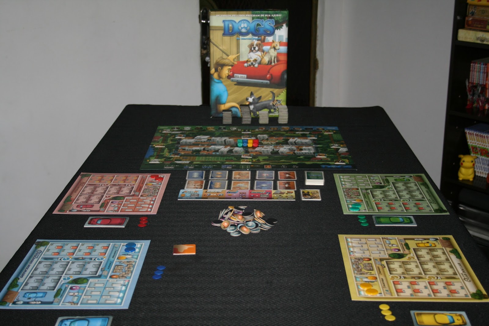 Em Dogs, os jogadores disputam para ver quem é o melhor administrador de abrigo de cães. O tabuleiro principal apresenta a cidade onde os cães estão dispostos para serem coletados e cada jogador possui seu tabuleiro individual que representa seu abrigo. Ambos os tabuleiros são excelentes, o principal se destaca pelo ótimo trabalho de arte do Diego Sanchez e os individuais por sua funcionalidade, tem espaço para acomodar todos os itens necessários confortavelmente, tudo muito bem divido e indicado com clareza. Além disso, o jogo também possui um tabuleiro de seleção de ações, que consiste em sua parte mais estratégica.