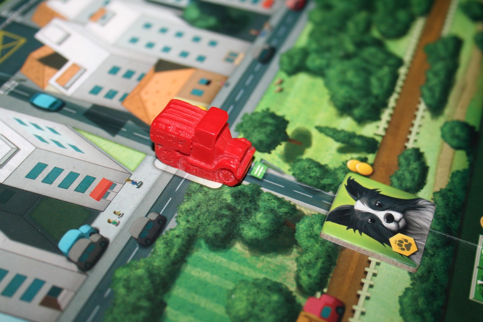 A edição gringa também alterou a cor da parte de trás dos tiles dos cães para diferenciar os do campo e os da cidade, aqui é branco e preto, lá eles alteraram para azul e verde. Além disso, eles adicionaram sacolas para colocar os cães, que não ficarão mais empilhados. Acho que isso organiza melhor o jogo e ainda dificulta um pouco calcular o seu final.