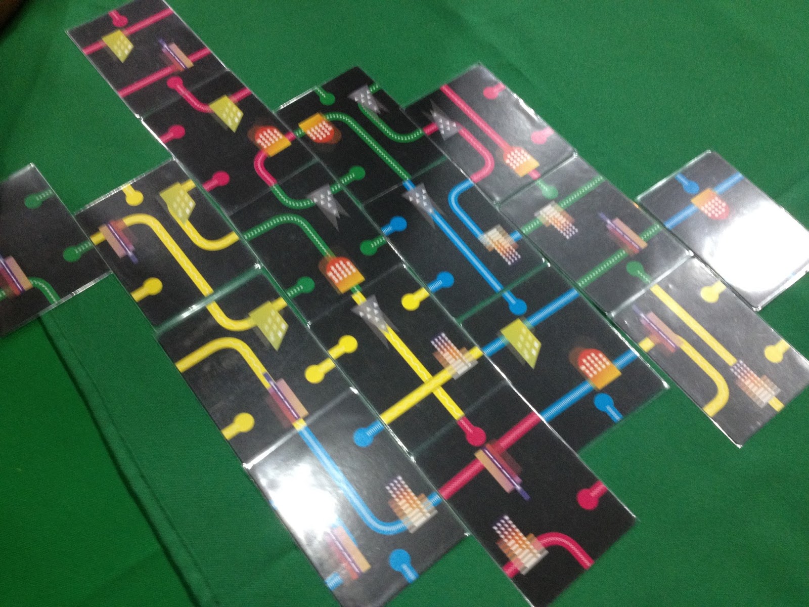 As cartas são colocadas de uma forma pré-definida pela quantidade de jogadores, e assim que uma rota é fechada, verifica-se a quantidade de trechos de cada cor, a(s) cor(es) vencedora(s) recebe um ponto para cada prédio diferente.