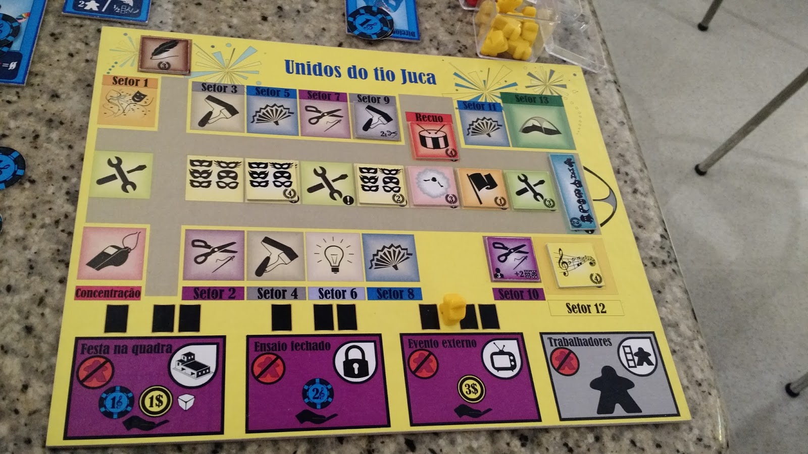 Outros pontos que valem menção: No tabuleiro individual, além de posicionar os tiles que vão compor o desfile, ainda existe a opção de ações internas da escola que eu gostei bastante, são coisas como: ensaio fechado ou festa na quadra. Um dos recursos do jogo é componentes (isso mesmo, pessoas), eu achei uma ótima sacada temática. Outra ideia muito boa ainda dentro da questão do tema é a possibilidade do atraso, que permite ao jogador perder pontos para jogar um turno adicional após o encerramento do jogo.