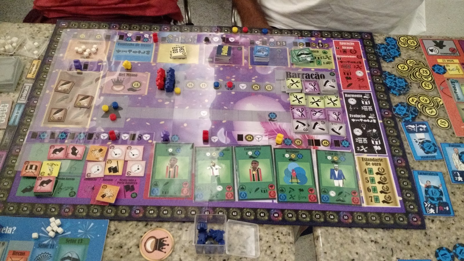 Depois de me decepcionar um pouco com o acasalamento dos pandas, fui conhecer o surpreendente Folia. Digo isso porque ele ainda está com um visual meio confuso e ocupa um bom espaço na mesa, dois fatores pouco atrativos. Fora que eu já joguei o Ziriguidum do Leandro Pires, impossível evitar comparações, tendo ambos o mesmo tema. Mas são jogos com mecânicas bem diferentes. O Folia é um Worker Placement bem tradicional. Os jogadores usam seus Workers para adquirir os diversos itens necessários para o desfile de sua escola.