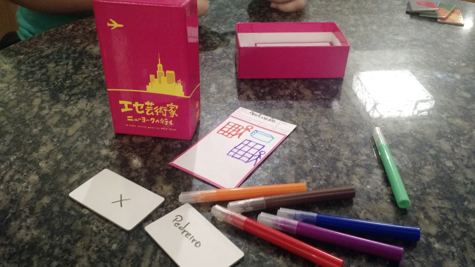 Depois eu joguei uma partidinha de A Fake Artist Goes To New York, mais um joguinho japonês simples, rápido e criativo. Um jogador escolhe uma categoria e escreve em uma folha de papel para que todos vejam. Em seguida, ele escolhe um item específico dentro da categoria escolhida e escreve em placas individuais que são entregues secretamente ao demais jogadores. Porém, em uma dessas placas, no lugar do item específico haverá apenas um X. A folha de papel rodará a mesa duas vezes e cada jogador deverá desenhar o item específico que foi informado. Após isso, haverá um votação para determinar quem é o artista falso.