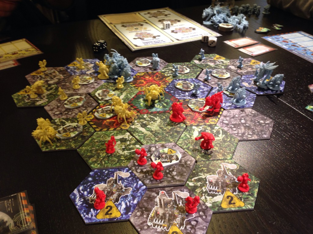 Em 2012 a Fantasy Flight comprou os direitos do jogo e o relançou com nova arte, algumas regras adicionais, mas se você conseguir a versão da Avalon, ela é muito mais legal, as miniaturas brilham sob a luz negra!!!!!