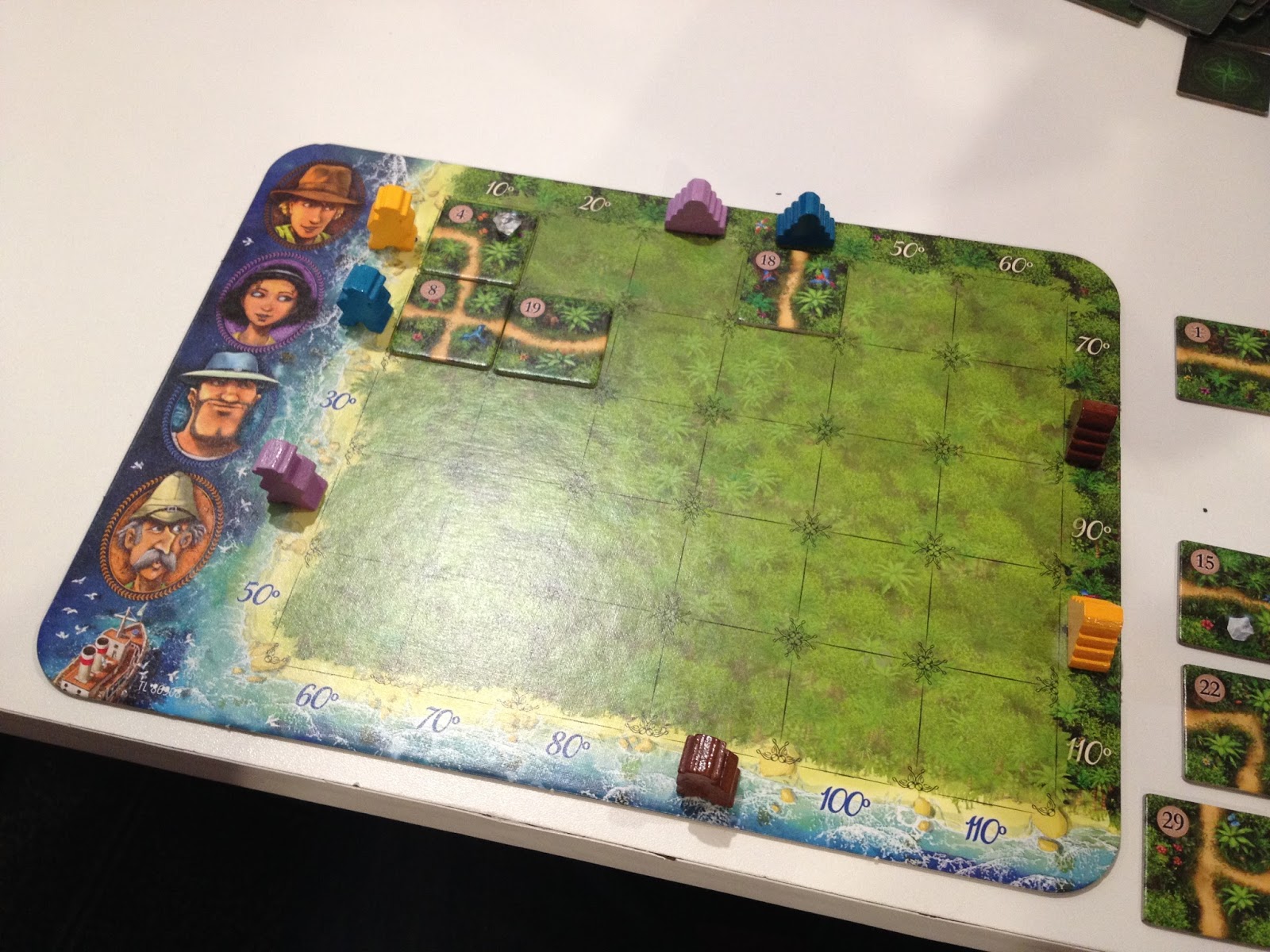 Cada jogador recebe no início da partida o seu tabuleiro, e tiles que vão de 1 a 36 e tem caminhos exatamente iguais para todos, durante o setup colocamos 4 aventureiros de cores diferentes e 4 templos representando esses aventureiros, o objetivo é tentar levá-los até os templos usando os caminhos, quem chega primeiro, pega os melhores pontos.