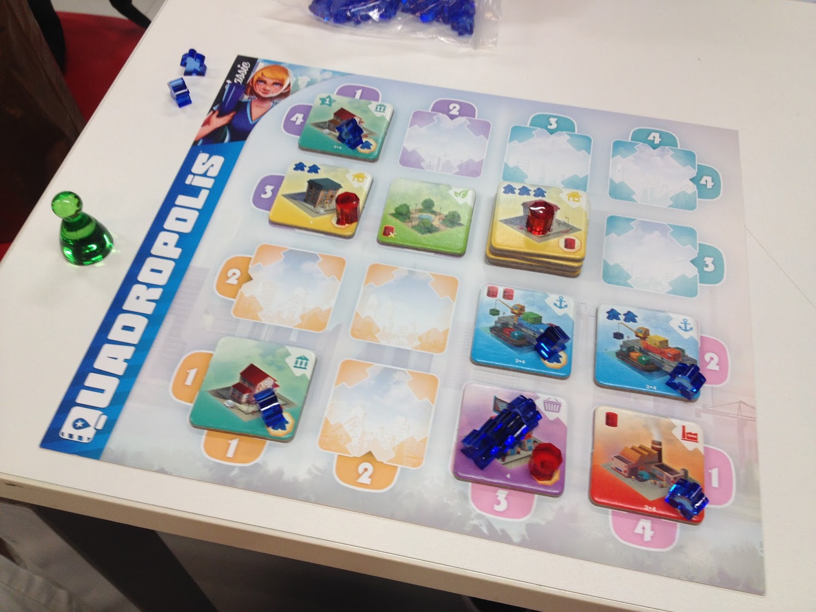A primeira coisa que eu curti muito no Quadropolis foi essa seleção de tiles. Cada jogador tem quatro funcionários numerados de 1 a 4, você posiciona um deles no tabuleiro central para pegar um dos tiles, e o número dele vai definir onde você vai colocar aquele tile no seu tabuleiro.