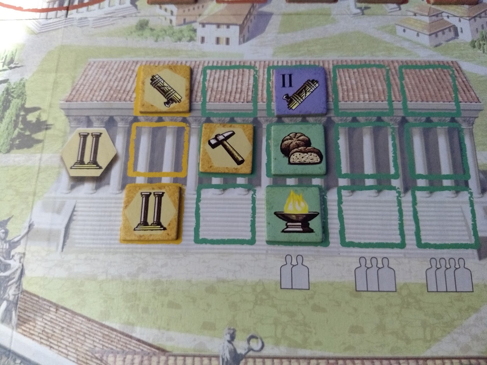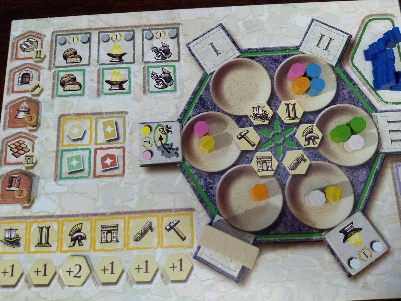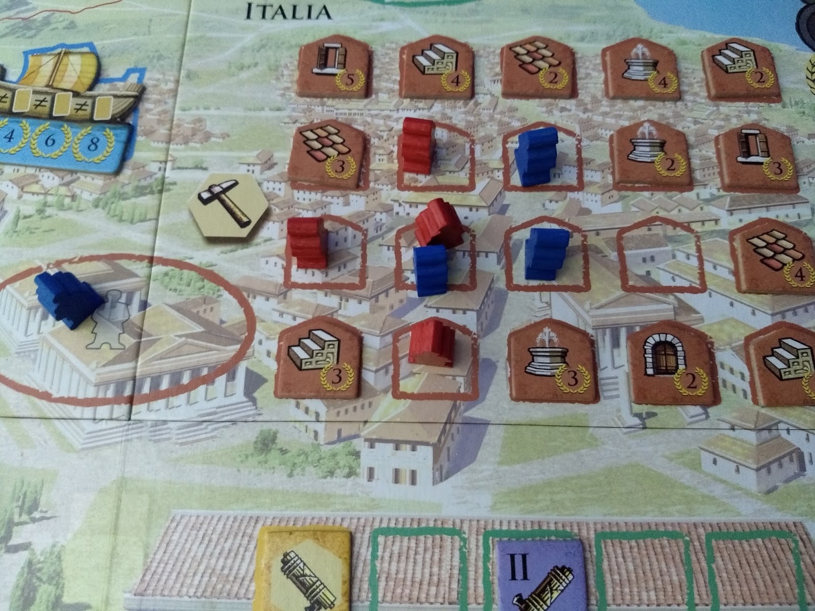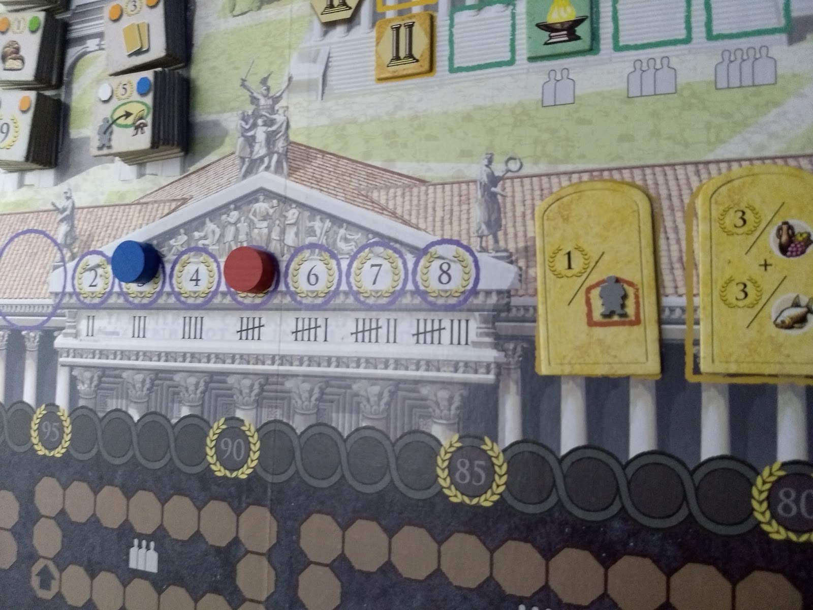 Já a área do senado te servirá basicamente pra conseguir os tiles de bônus desejados, apesar de dar pontos de vitória (mas, afinal, o que não dá ponto nesse jogo?). É possível que você se dedique a esse tipo de ação para ganhar cada vez mais pontos no track de senado e pegar todos os tiles bônus, fazendo um pouco de cada outra área e garantindo uma boa quantidade de pontos no final. Mas como não existe tile de trajan nem de bônus relacionado ao senado, pode ser que seu jogo fique um pouco empacado. Por essa razão, essa estratégia me parece ineficiente e nunca me arrisquei nela (mas acho que vale uma tentativa, agora que estou pensando melhor sobre isso).