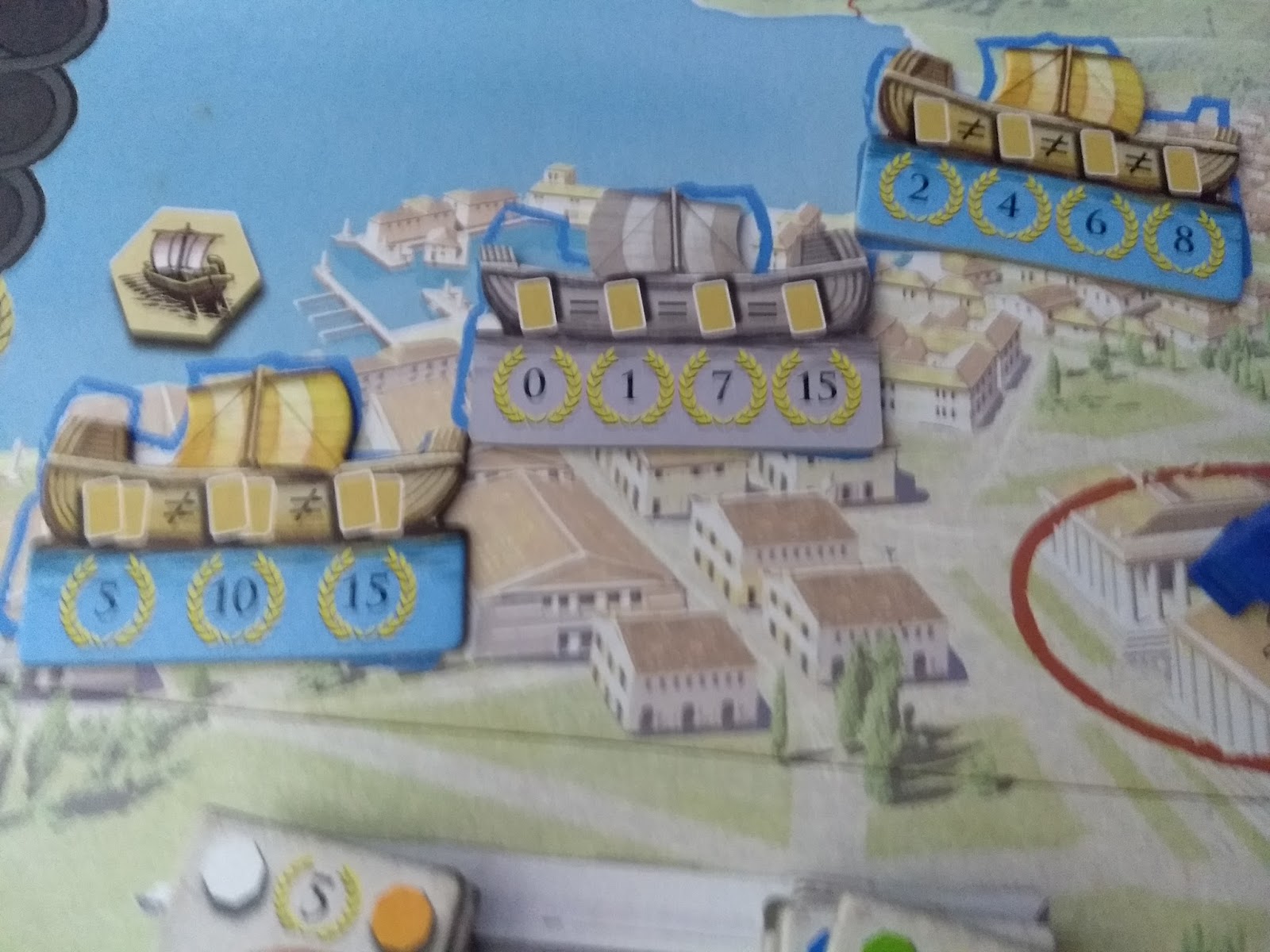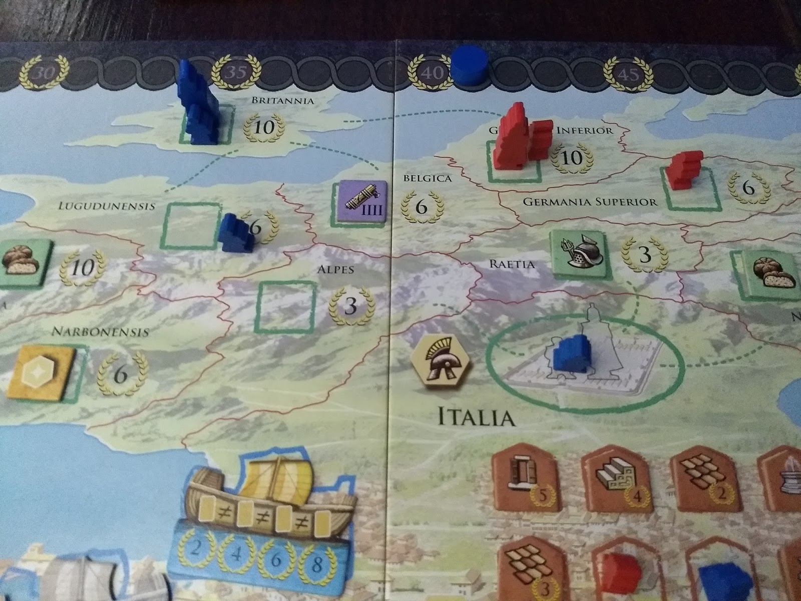 Aliás, essa falta de interação pode ser um ponto negativo para os que gostam de uma boa disputa. Mas o jogo não deixa de propiciar tais disputas em seus mecanismos. Além do já mencionado controle de área nas ações militares e de construção, ele possui "corridas" para ver quem fica na frente no track do senado, quem pega primeiro aquele tile correspondente a uma das demandas na área do fórum, ou quem irá usufruir da pontuação mais alta de um determinado barco quando enviar suas mercadorias (as cartas). Como todas essas áreas são renovadas após 1 ano, essas disputas recomeçarão, evitando que alguém garanta a primazia em uma dessas áreas durante todo o jogo (lembrando que a partida se passa durante 4 anos).