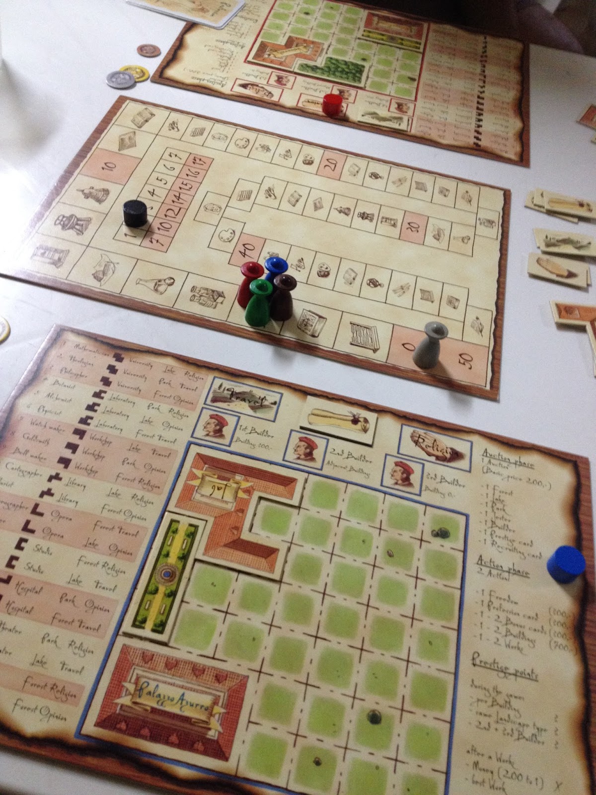 Em Princes of Florence temo dois momentos distintos, num primeiro momentos são leiloados itens que serão utilizados na segunda parte da segunda fase dos sete turnos que compõe uma partida.