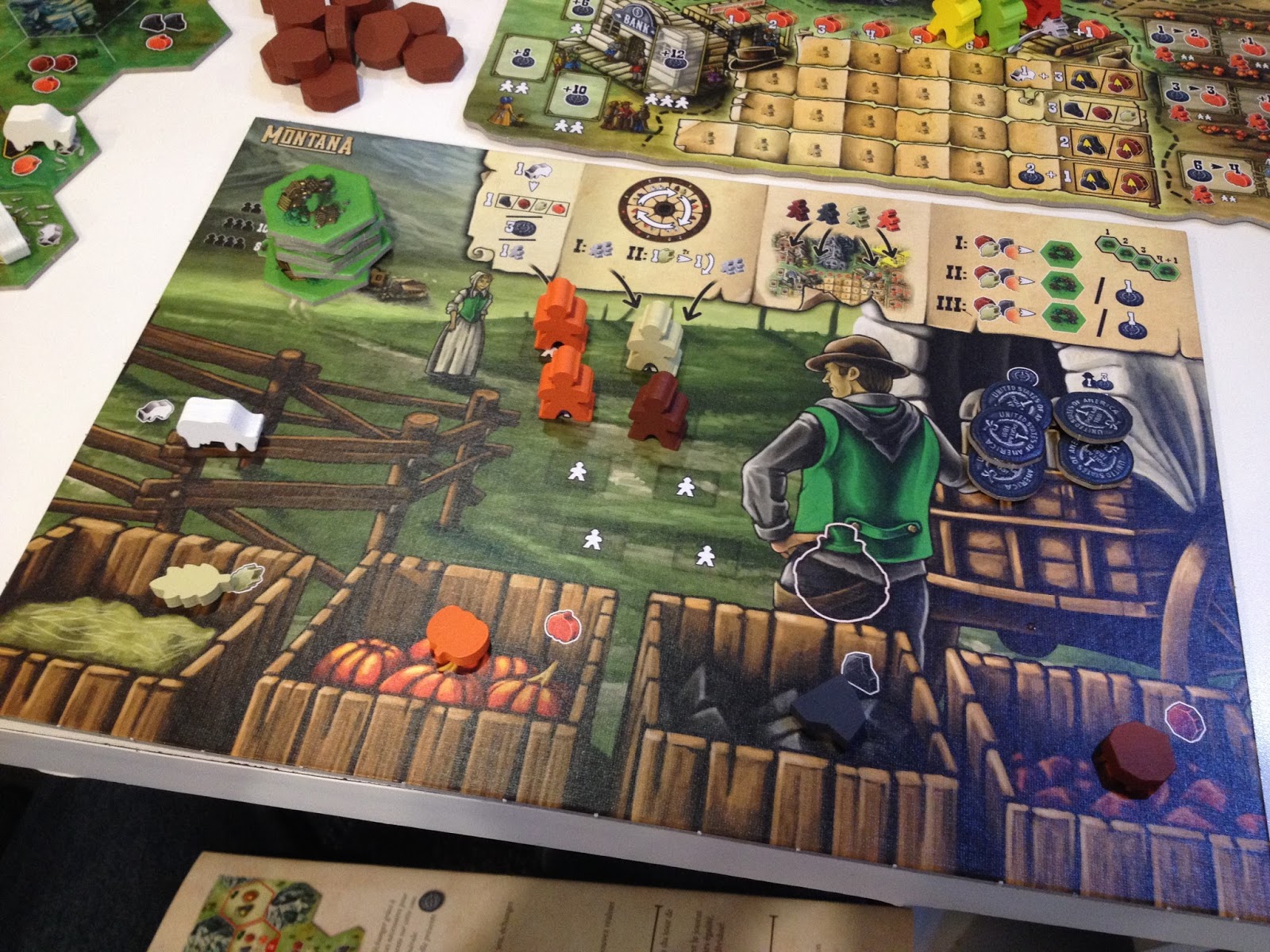 Cada jogador tem no seu tabuleiro espaço para oito trabalhadores, um curral para seu gado e para sua produção de bens que variam entre cobre, pedra, grãos e abóbora.