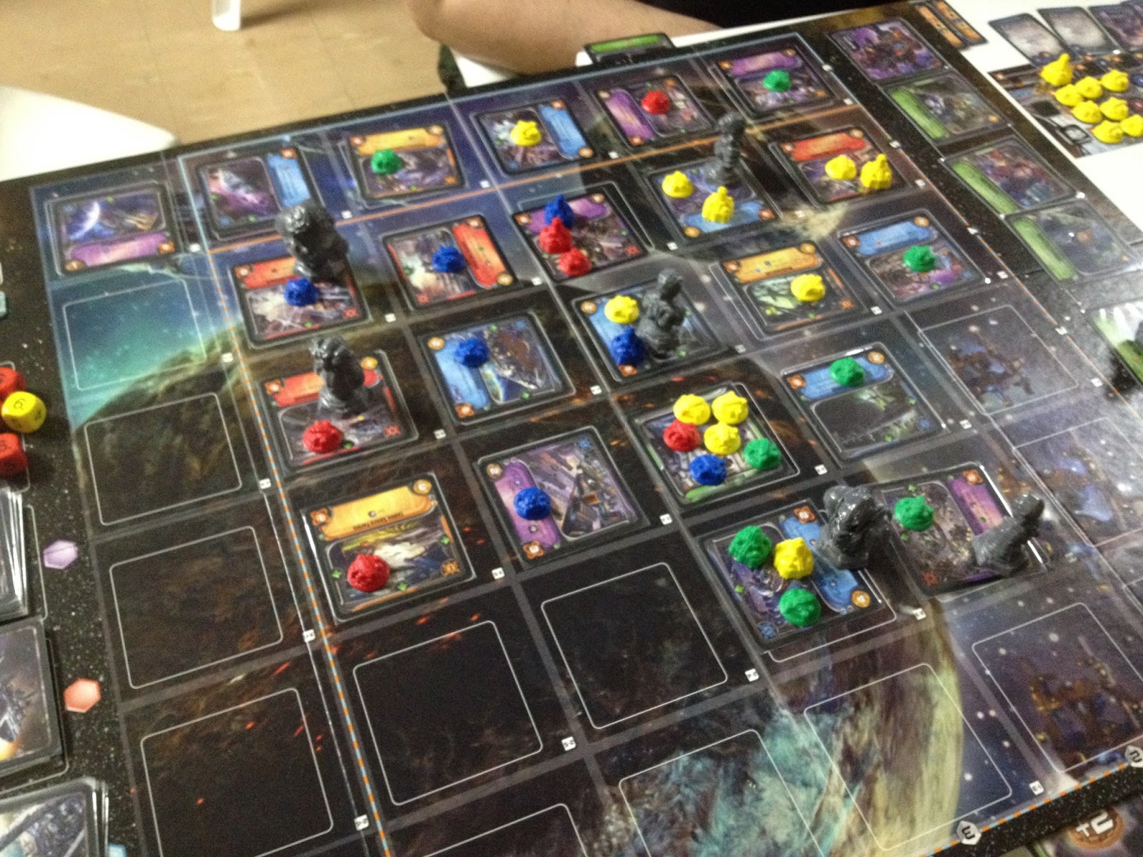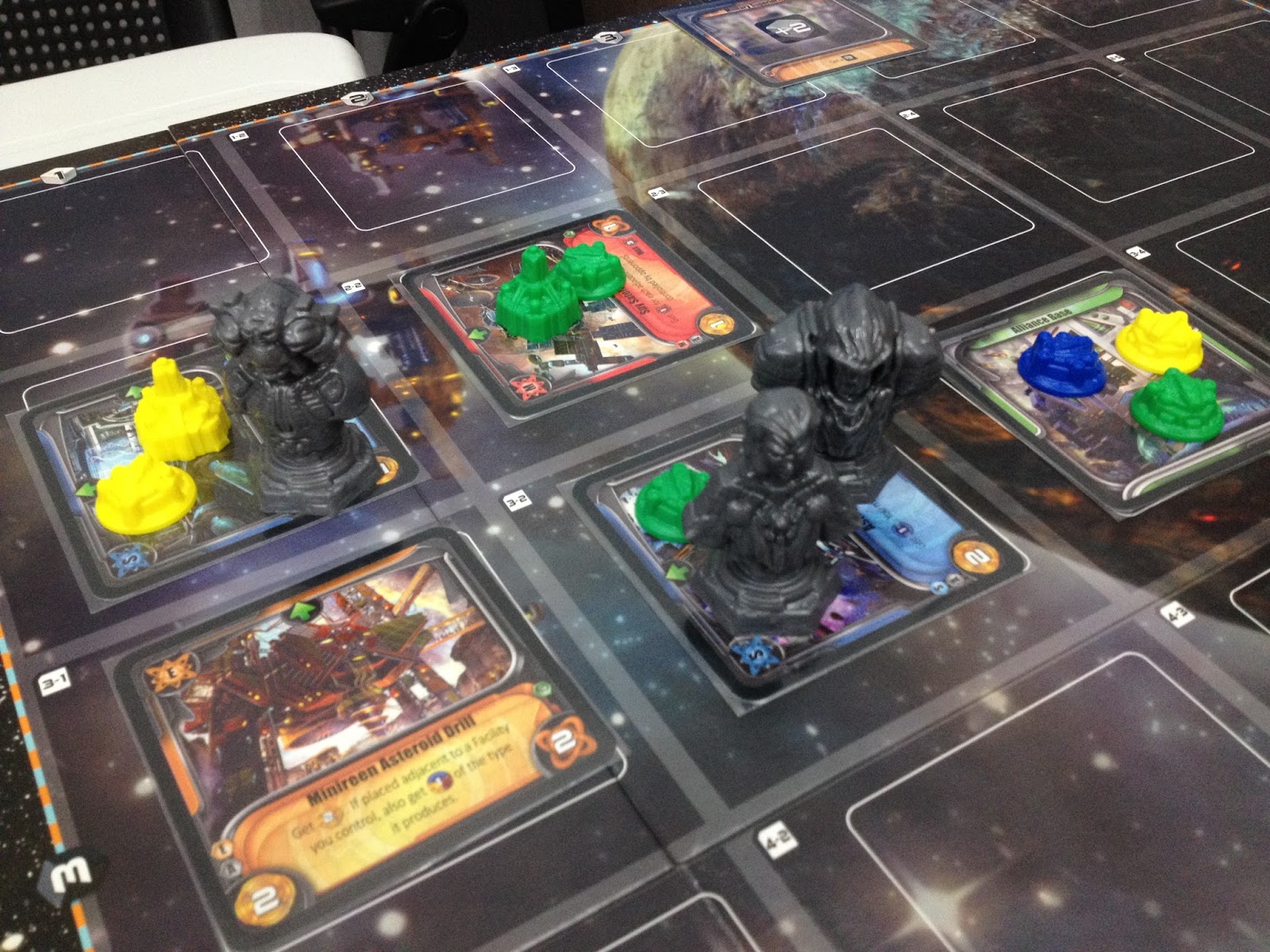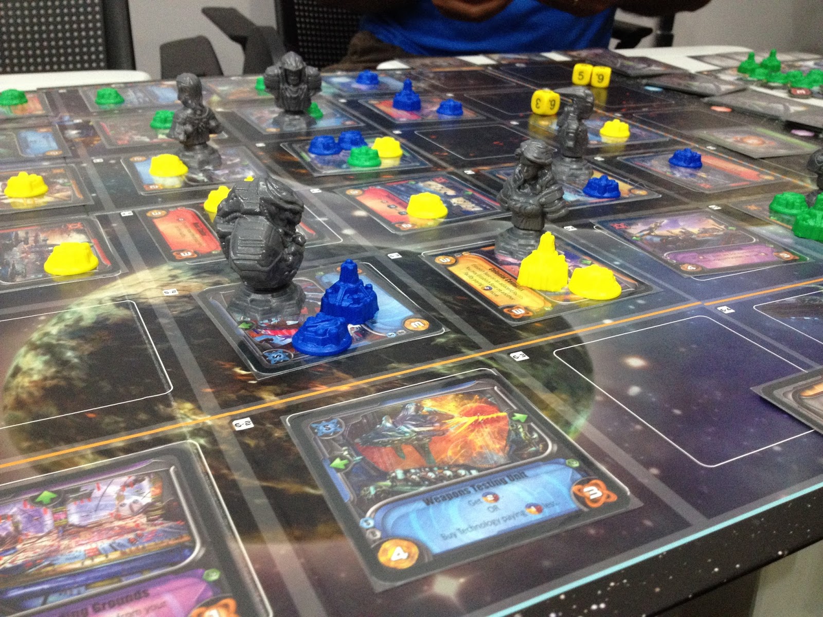 Uma vez que as ações terminam, podemos pagar tributo para a Aliança, que nos rende pontos de vitória ao final do jogo, e ao final das cinco rodadas somamos os pontos de tributos, instalações que controlamos e uma série de outros pontos que vamos recebendo por construção de tecnologias e quarteis-generais e quem tiver a maior pontuação é a raça vencedora.